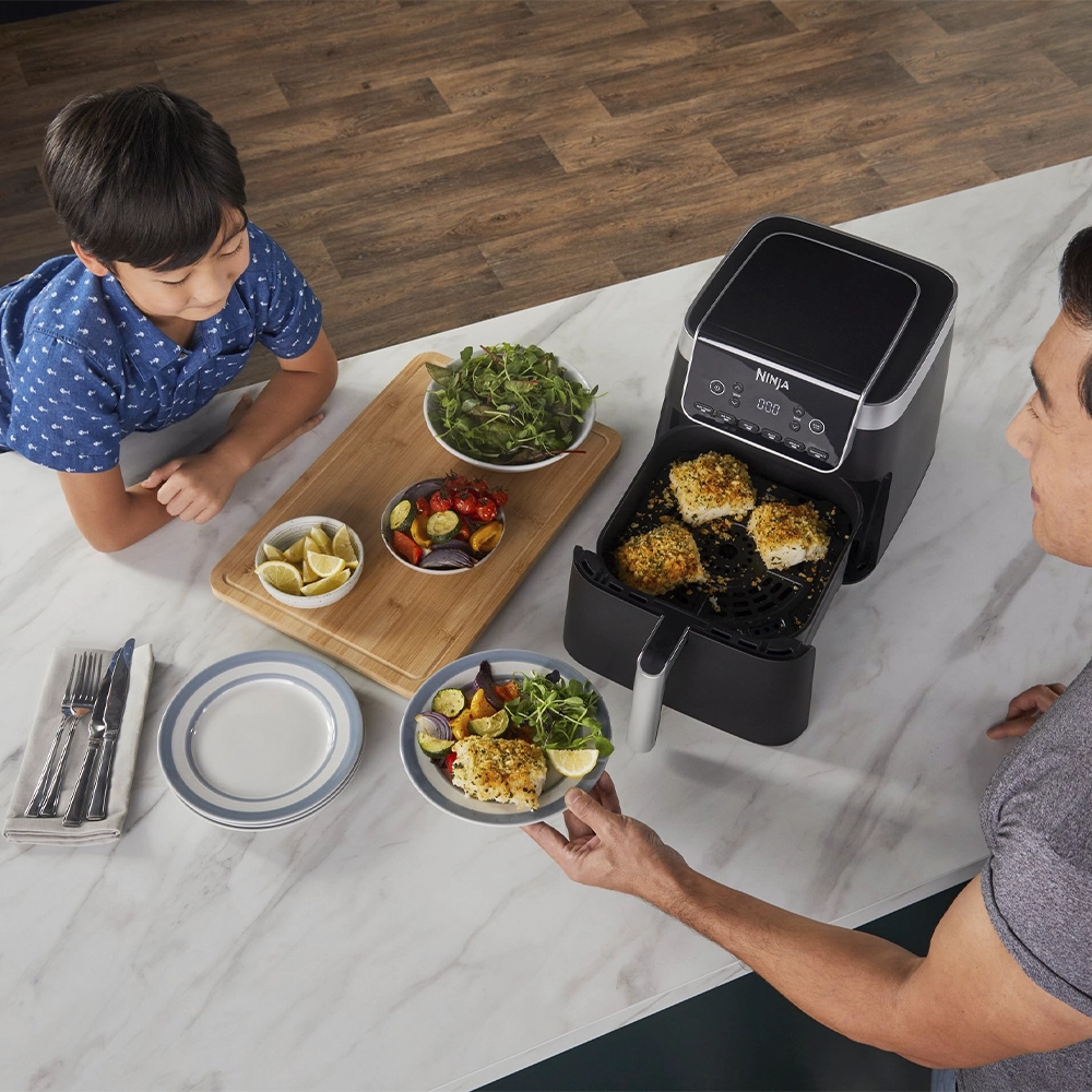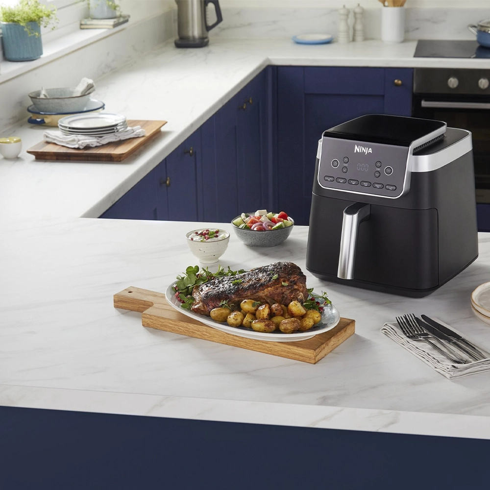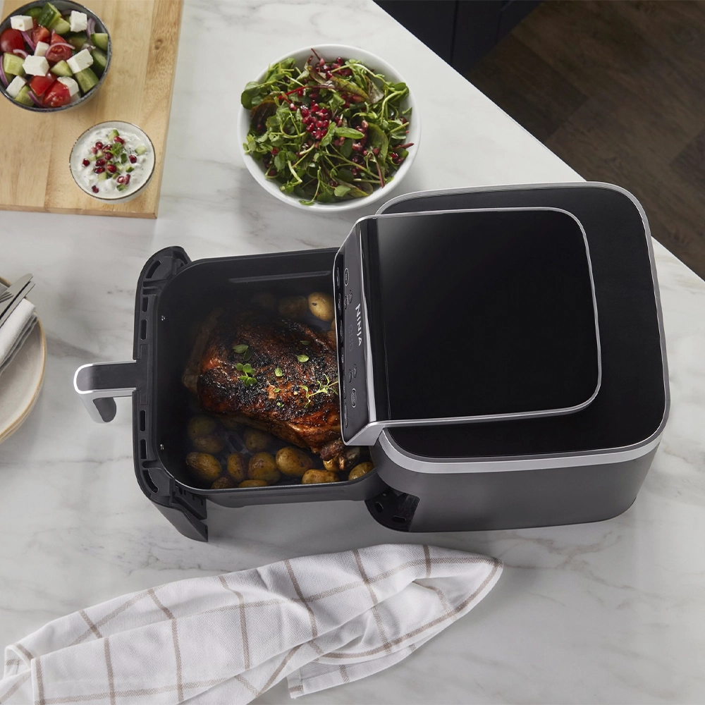 Ninja AF180EU 6.2L აეროგრილი არის მრავალფუნქციური მოწყობილობა, რომელიც აერთიანებს Air Fry, Max Crisp, Roast, Bake, Reheat და Dehydrate რეჟიმებს. მისი 2000 ვტ სიმძლავრე და 6.2 ლიტრიანი მოცულობა საშუალებას გაძლევთ მოამზადოთ ჯანსაღი და გემრიელი კერძები სწრაფად და მარტივად. მარტივი კონტროლი ხდის მას კომფორტულსა და პრაქტიკულ სამზარეულოსთვის.
